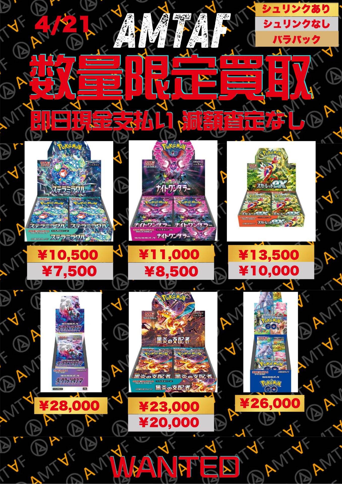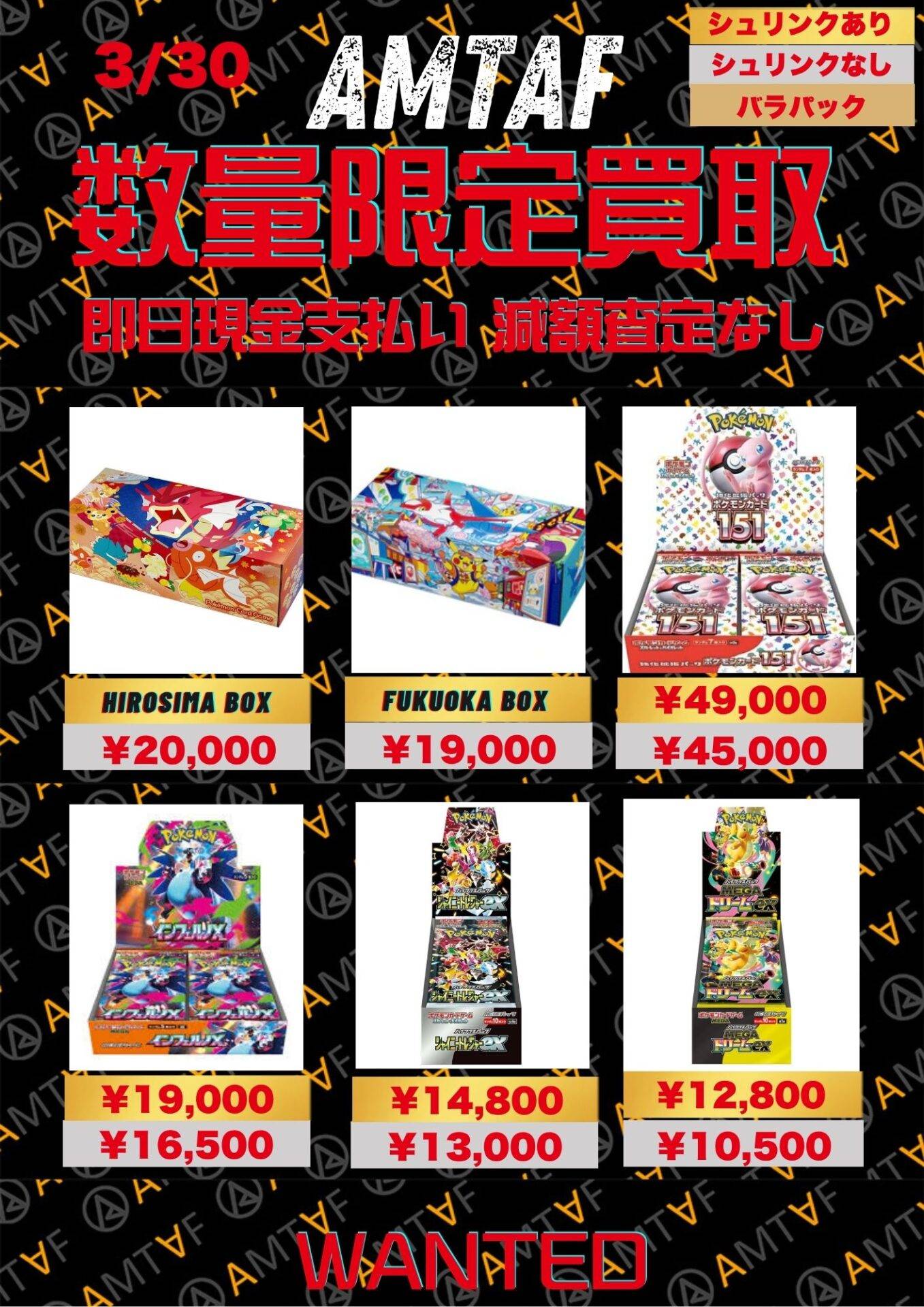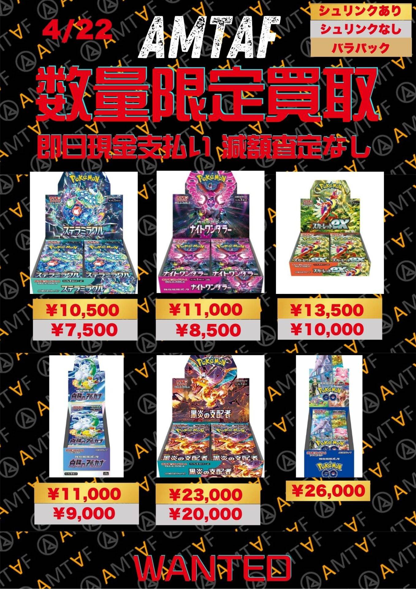 どのBOXも綺麗に保管されており、全て満額査定です!AMTAFではシュリンク付きシュリンクなしに関わらずBOX買取可能です。またバラパックも1パックから買取可能ですので、お気軽にご依頼くださいませ。